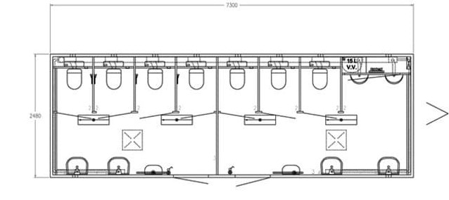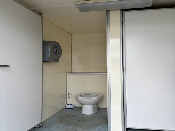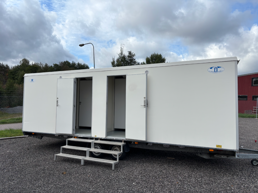 Toalettvagn med 6 st WC-platser, gråa golv samt vita dörrar. Vagnen är utrustad med toalettpapper, handtvål samt handfat och pappershanddukar. Vagnen är registrerad och får framföras på allmän väg i max 80 km/h. Anslutes till befintligt va-nät. El, värme och belysning.
